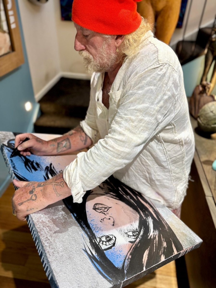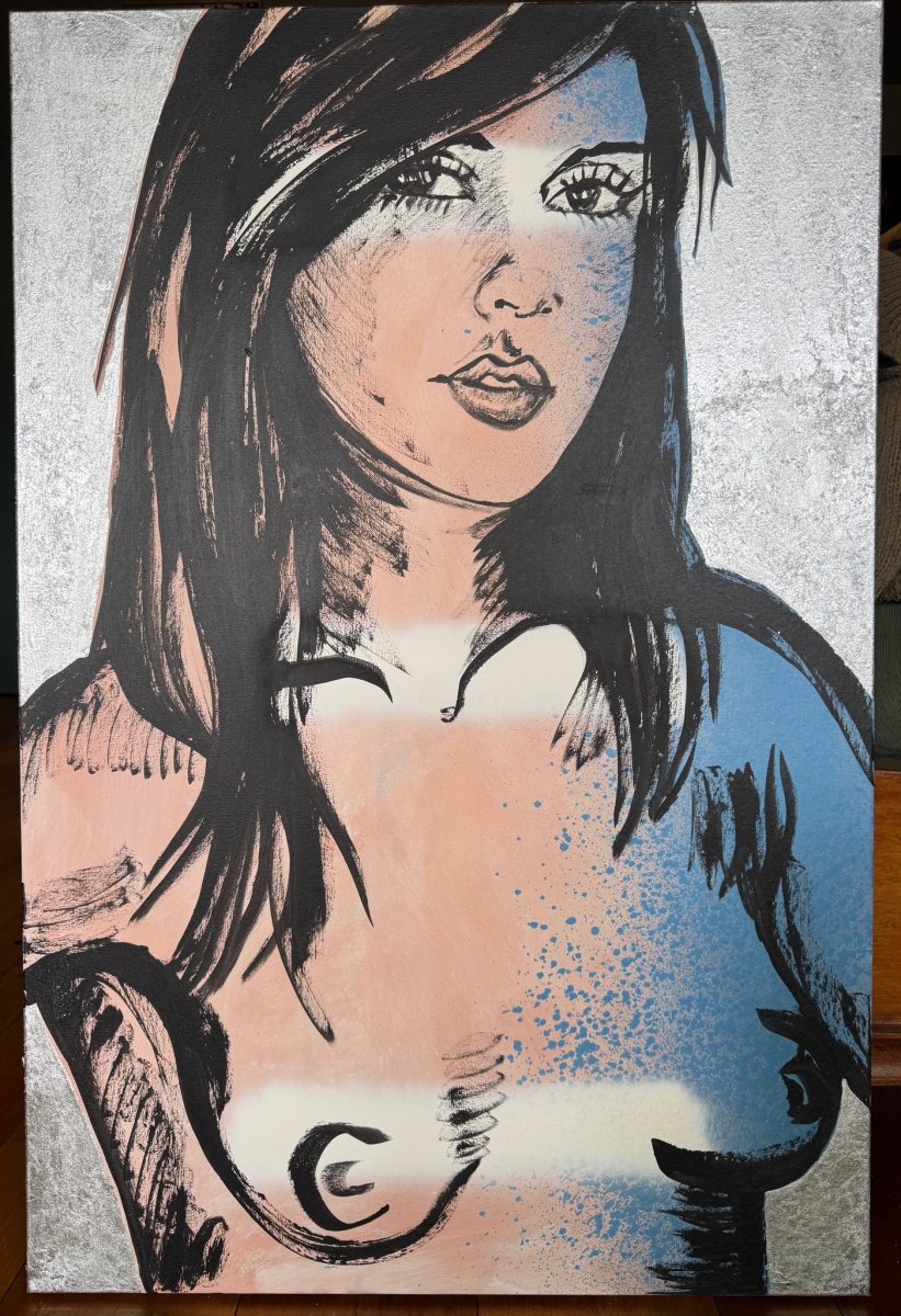 Painted with soft colours contrasted by graphic white stripes. With a warm, shimmering silver backdrop.