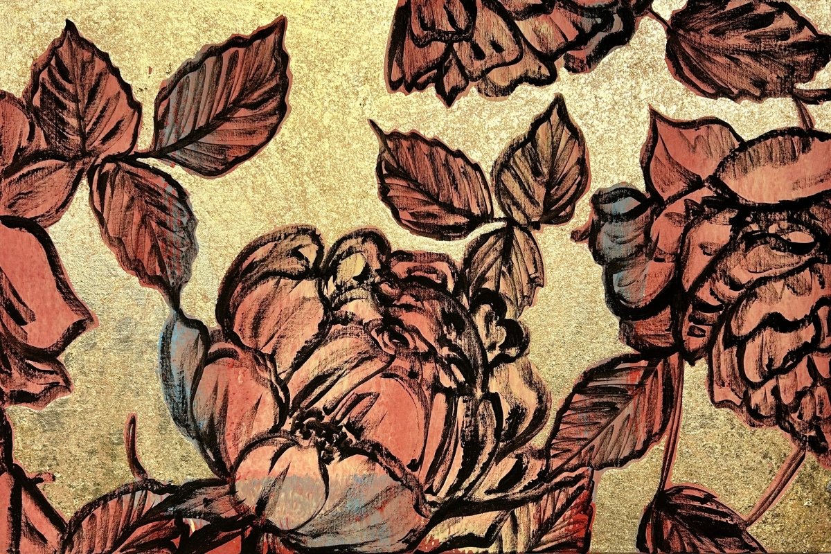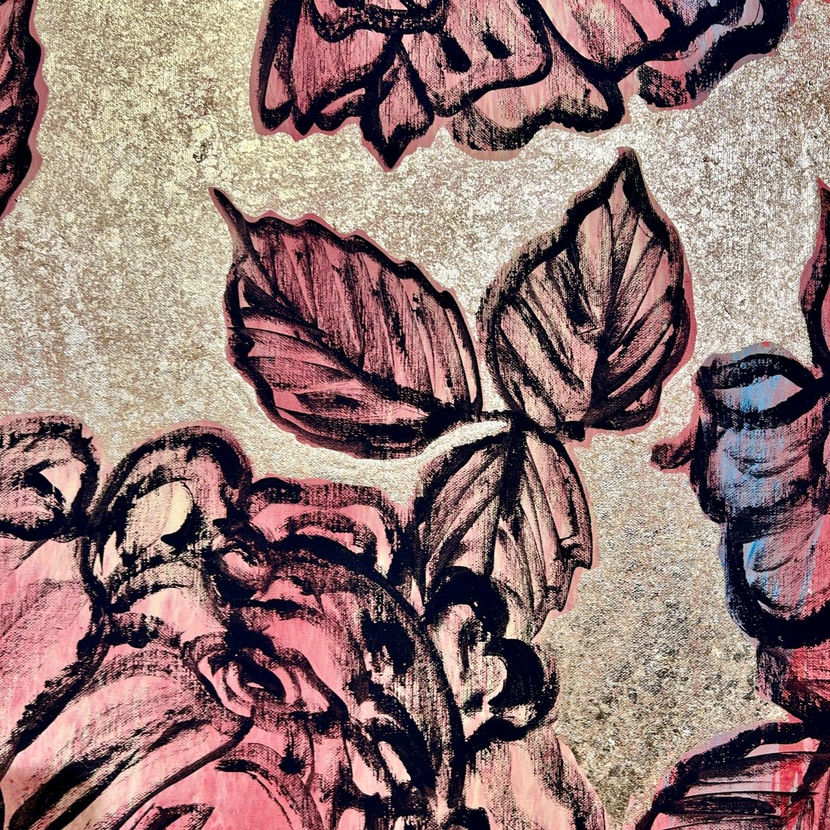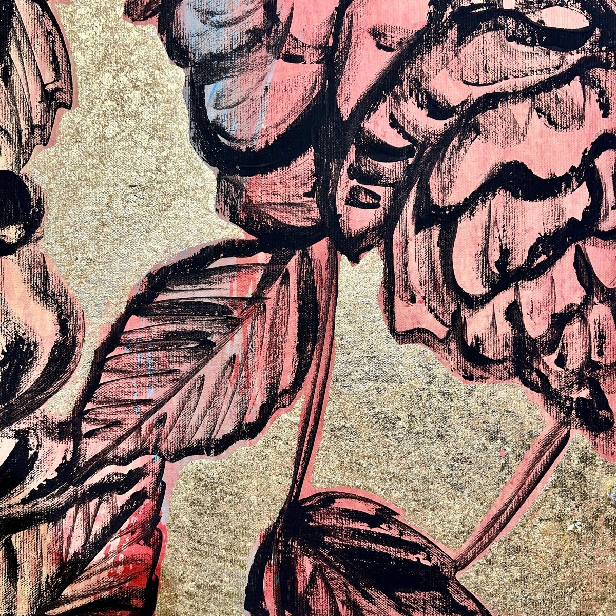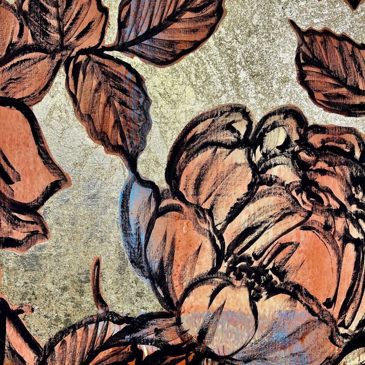 A beautiful floral painting from David Bromley's Nature Series. Inspired by his time surrounded by his gardens. Layered with graduated soft, warm colours. And a shimmering gold background. Acrylic on canvas with gold leaf gilding. This painting is located at our South Yarra gallery and will be signed prior to leaving the galleries