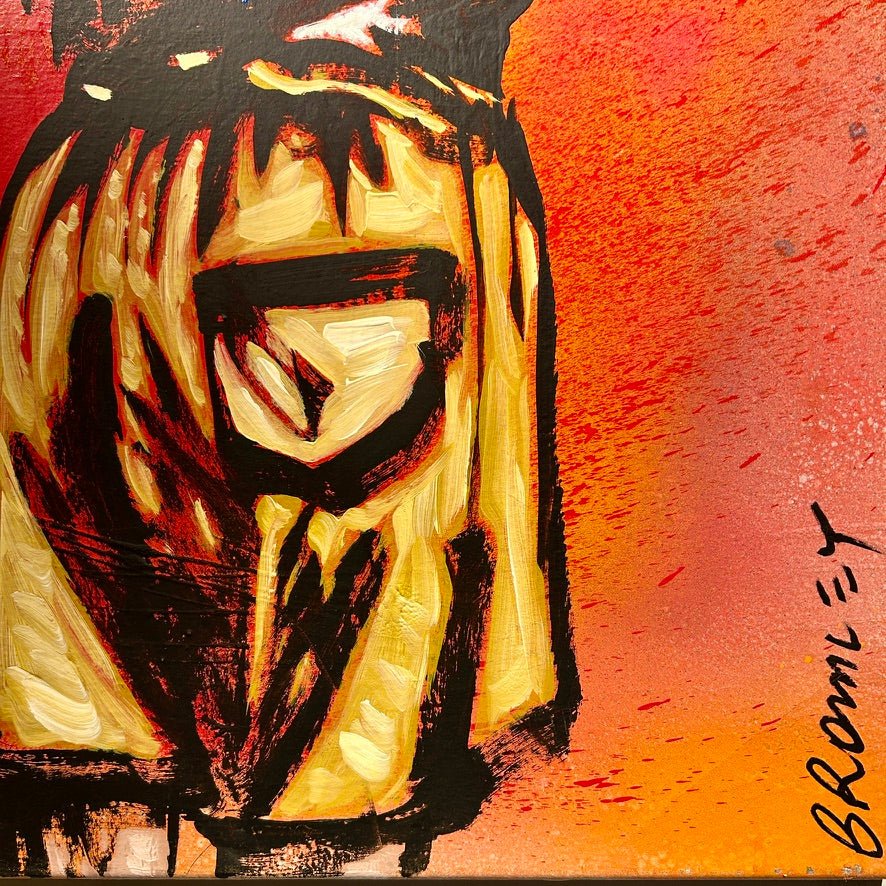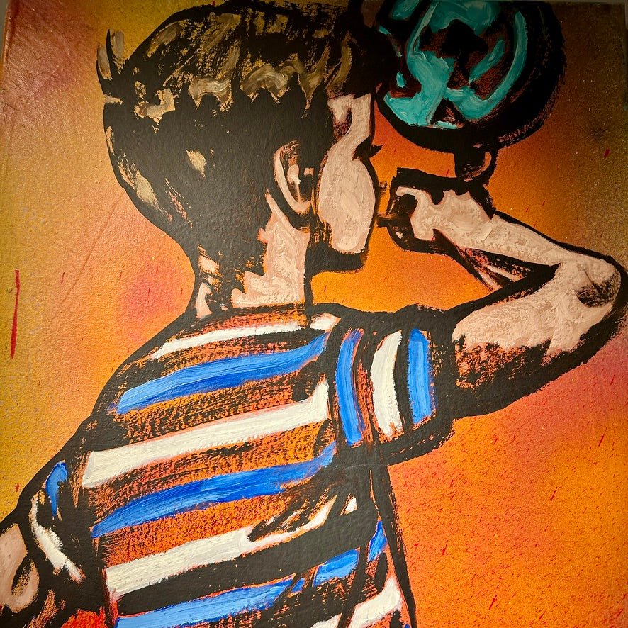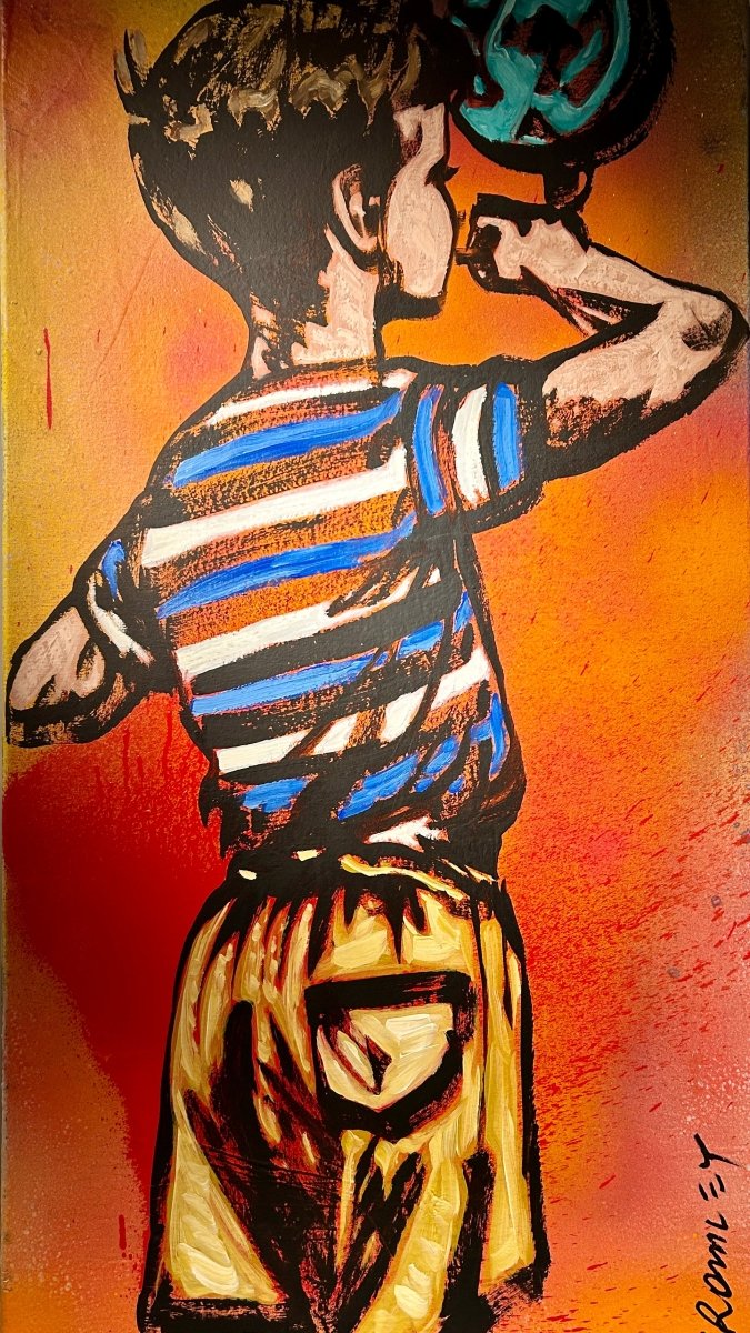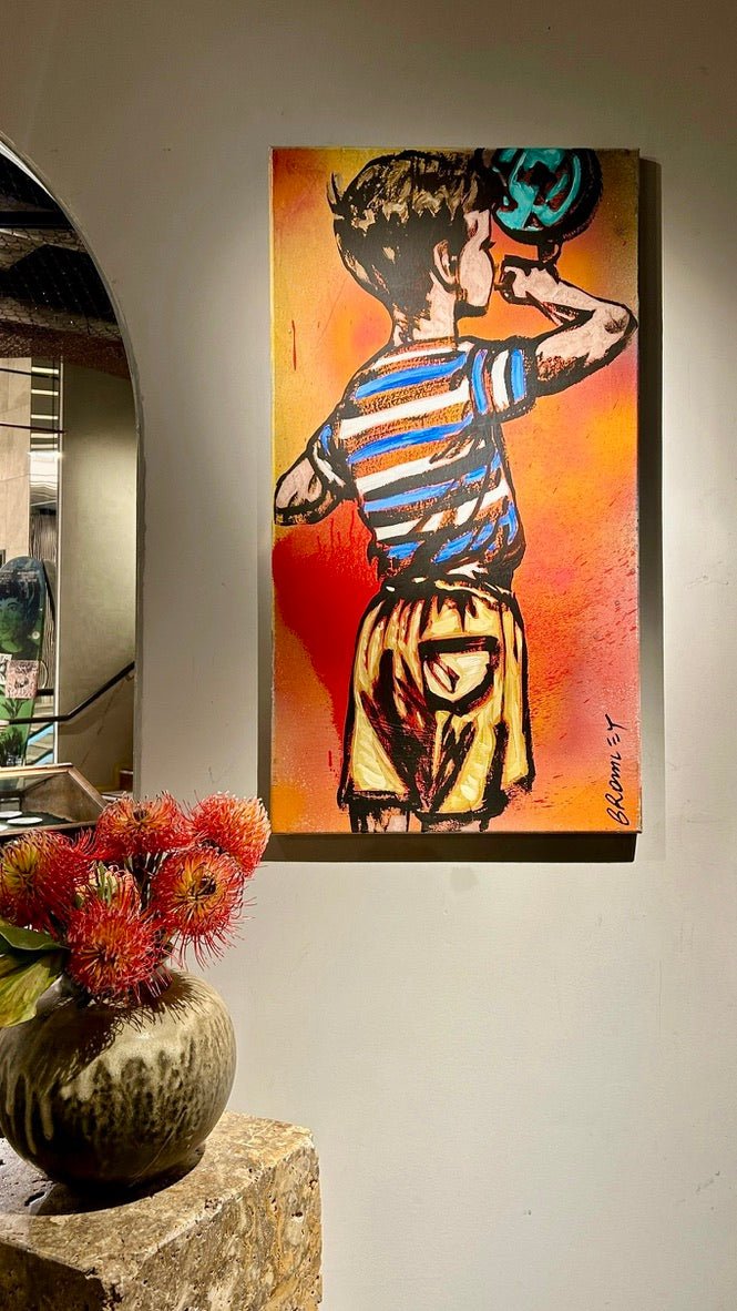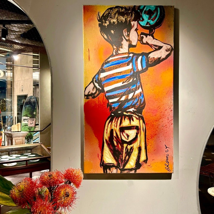 The classic Bubble Boy from David Bromley's Children's Series. With warm tones that make for an impactful backdrop, complimented by soft touches of blue and yellow tones. Acrylic and oil on canvas. 100 x 54cm. This painting is located at our South Yarra gallery.
