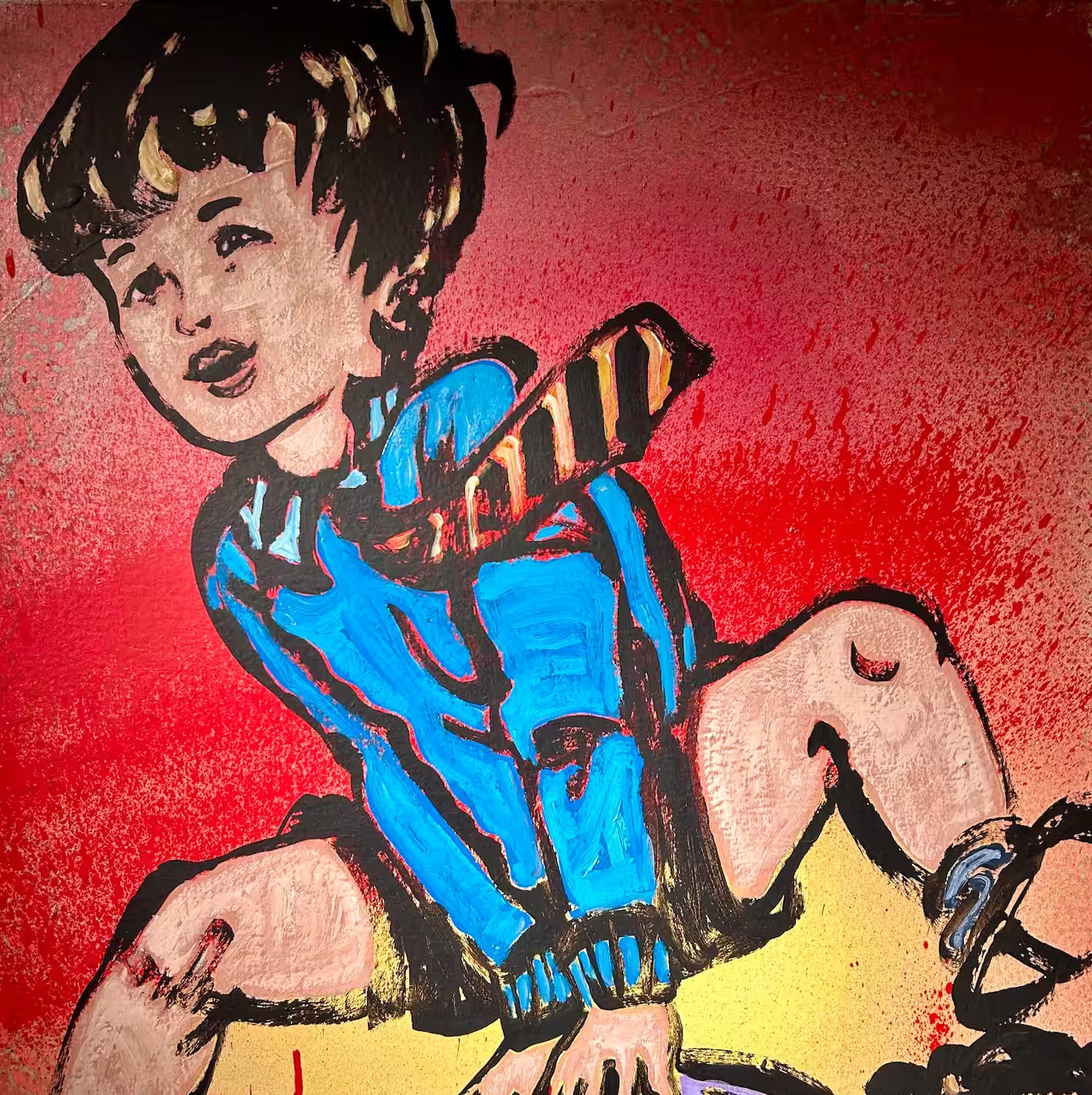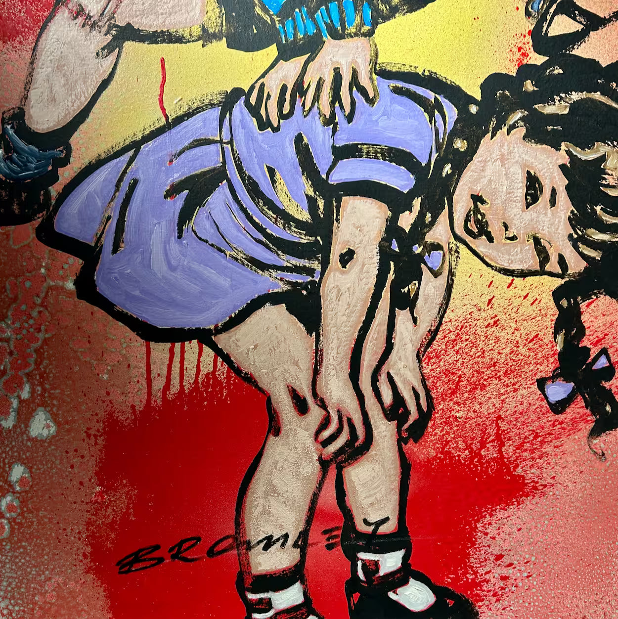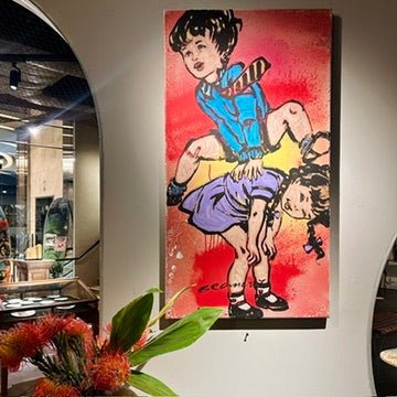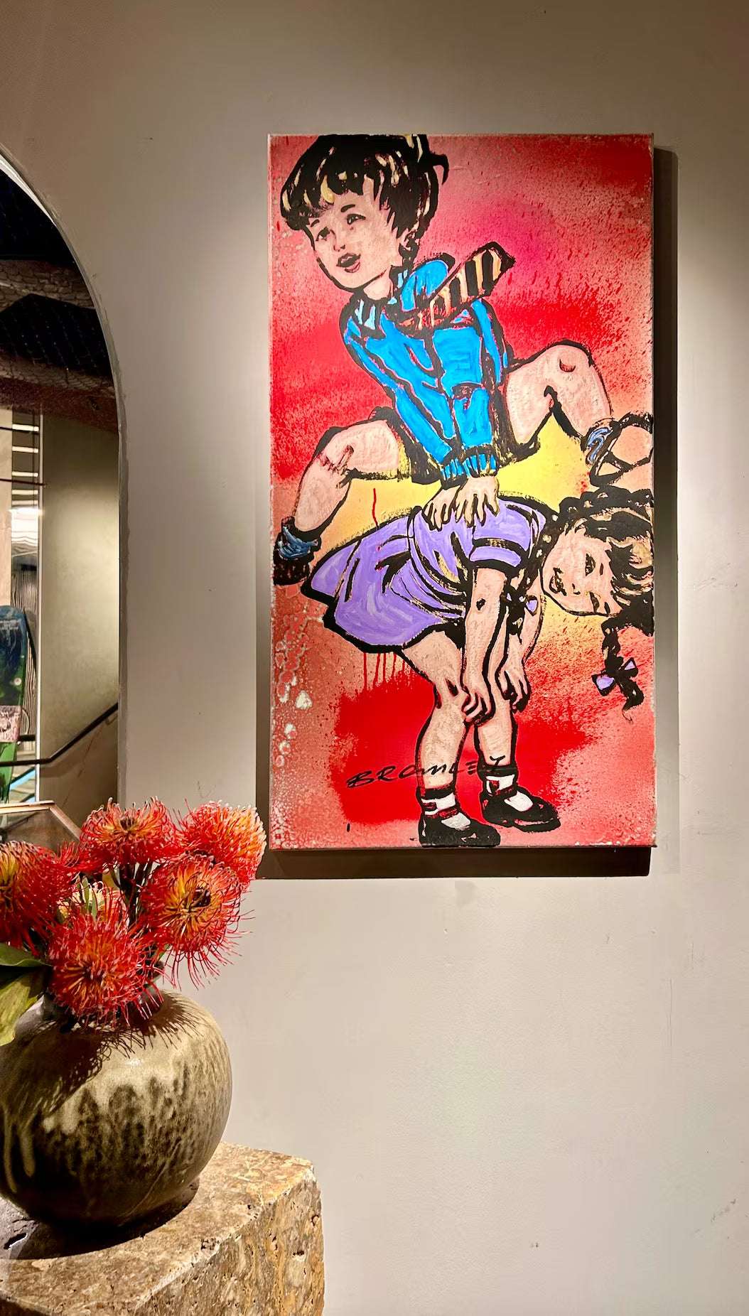 The joyful and nostalgic Leapfrog from David Bromley's Children's Series. With warm tones that make for an impactful backdrop, complimented by soft touches of blue and purple tones. Acrylic and oil on canvas. 100 x 54cm. This painting is located at our South Yarra gallery.