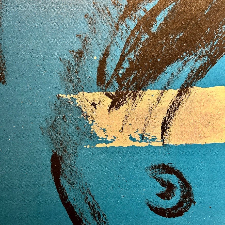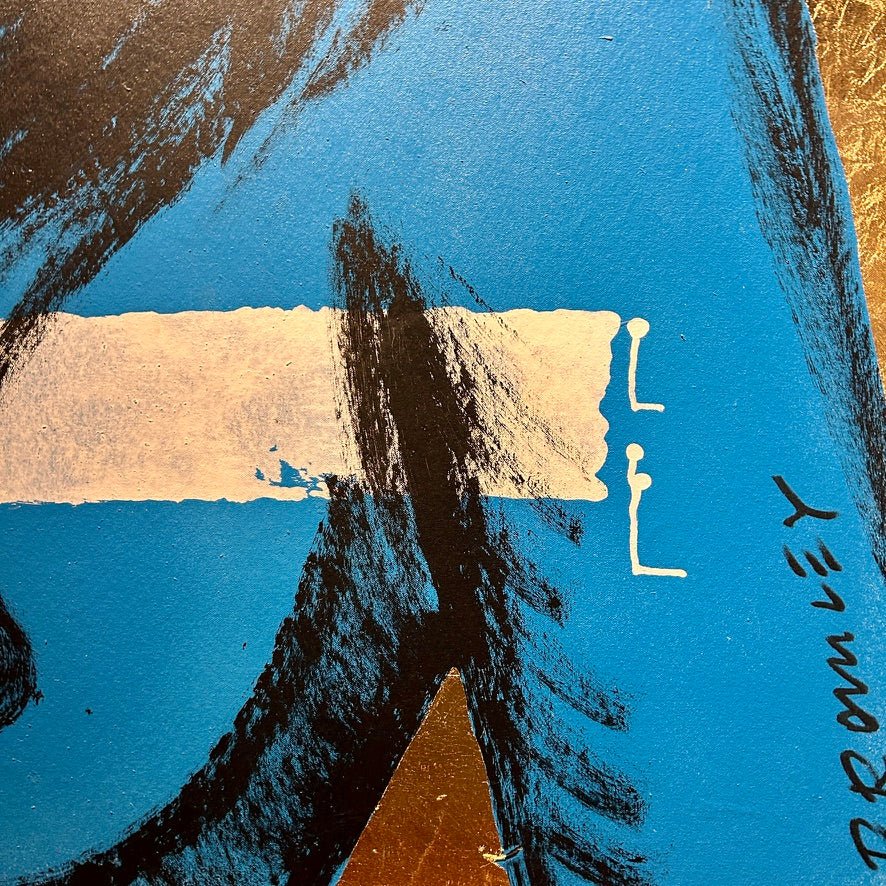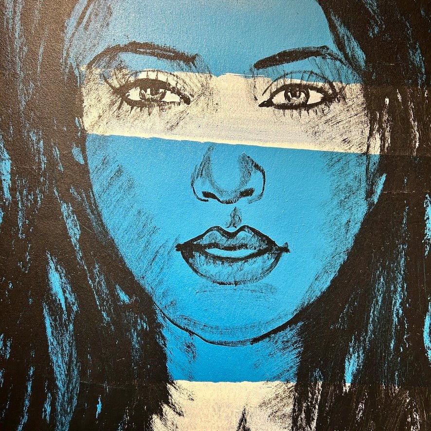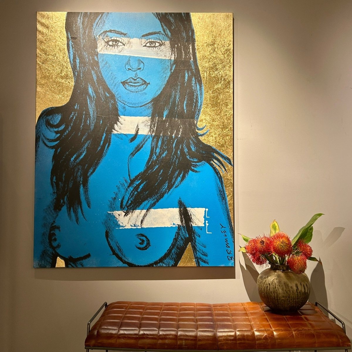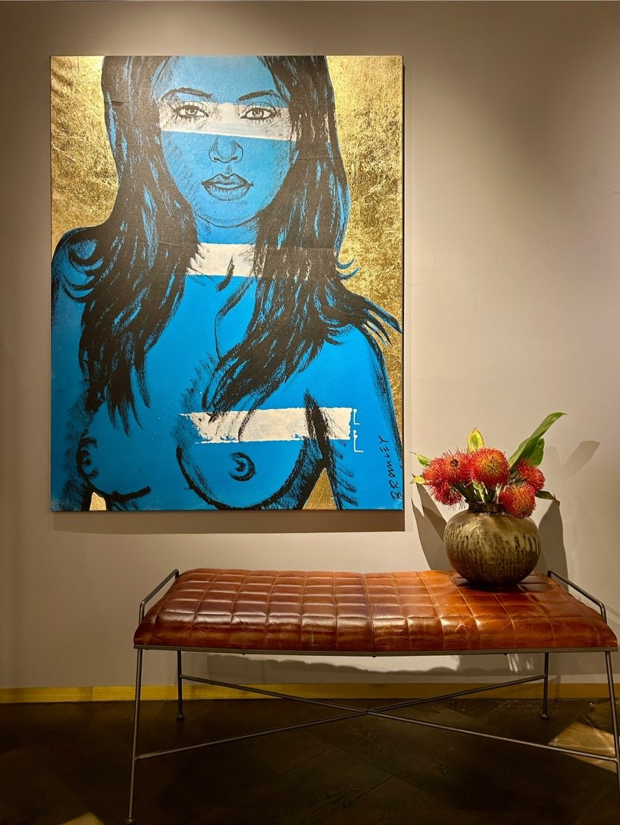 The beautiful 'Mallory' from David Bromley's Nude Series. Painted with rich blues contrasted by graphic white stripes. With a warm, shimmering gold backdrop. Acrylic, oil and gold leaf gilding on canvas. 160 x 122cm. This painting is located at our South Yarra gallery.
