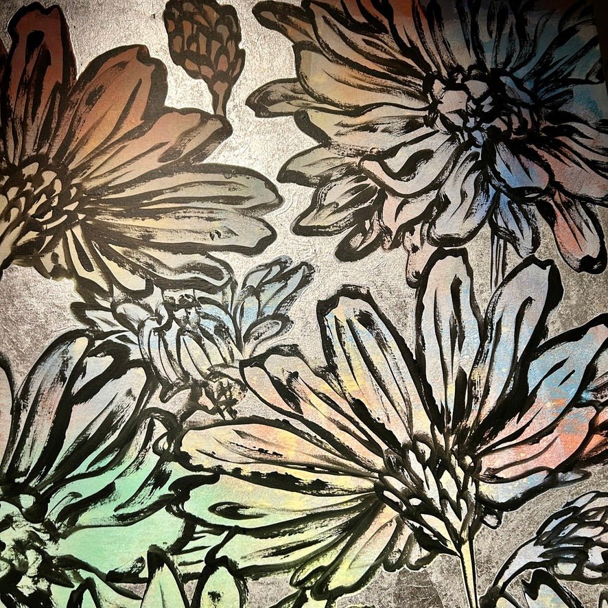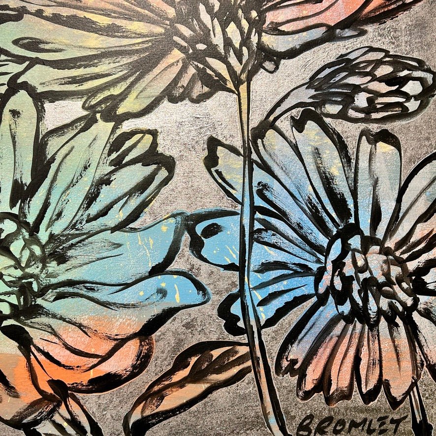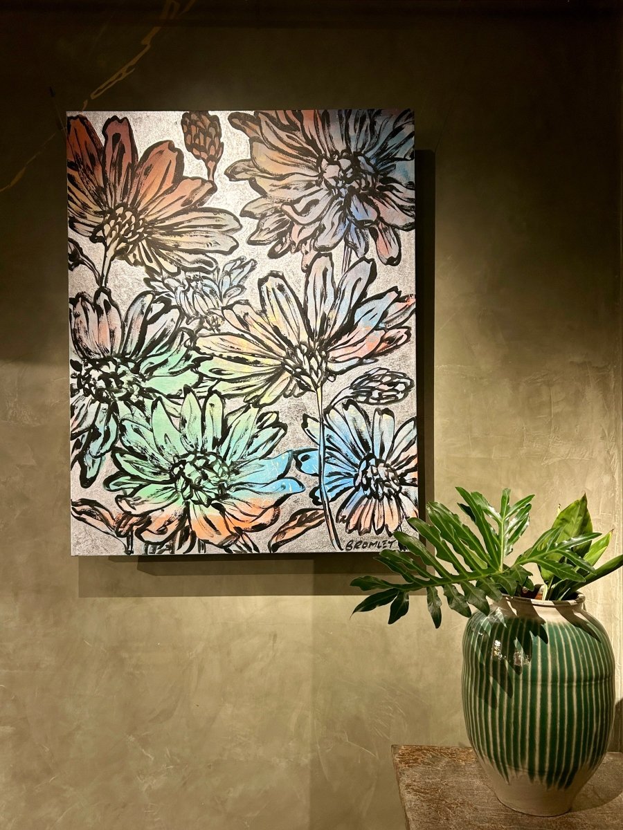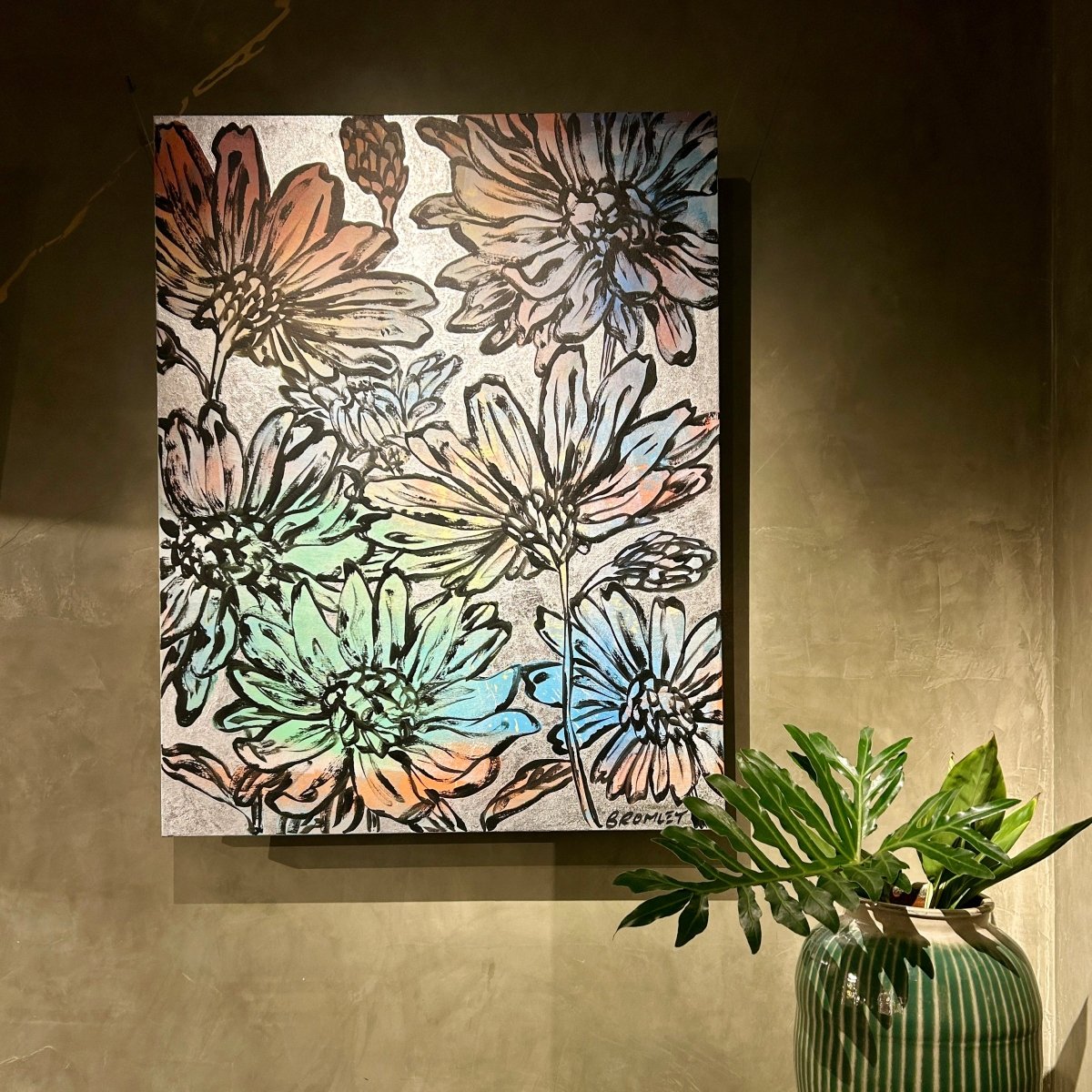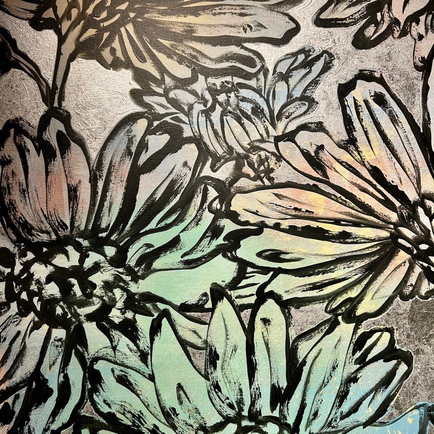 A beautiful floral painting from David Bromley's Nature Series. With a delicate colour palette of soft blues, greens and peachy tones, complimented by a shimmering silver background. Acrylic, oil and silver metal leafing on canvas. 146 x 114cm. This painting is located at our South Yarra gallery.