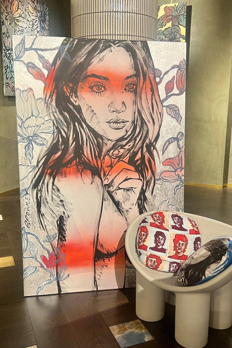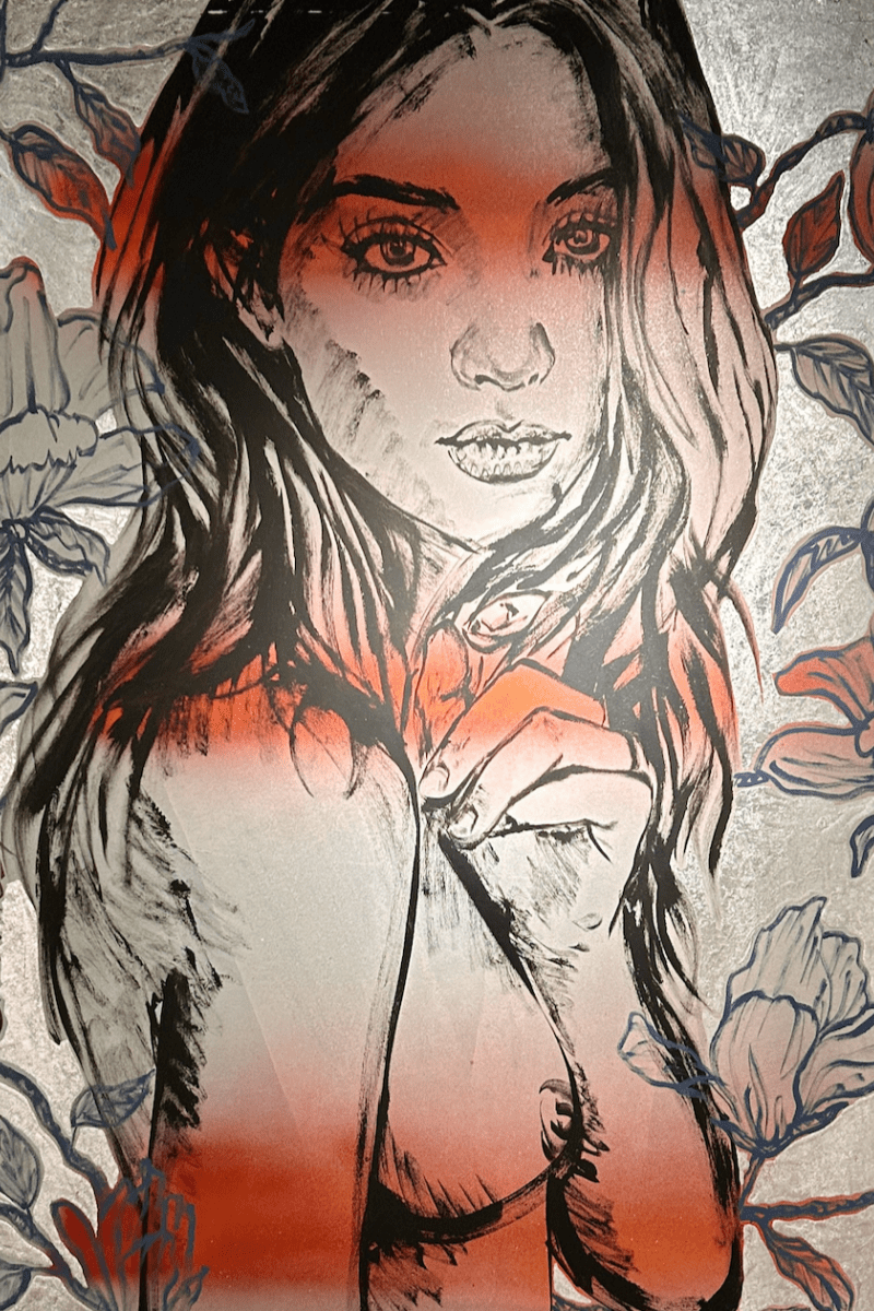 The gorgeous 'Rosie' from David Bromley's Nude Series. Painted with a simple colour palette, complimented by David's signature stripes to add dimension and warmth to the piece. With a shimmering silver background and meticulous floral details. Acrylic, oil and silver metal leafing on canvas. 180 x 120cm. This painting is located at our South Yarra gallery.
