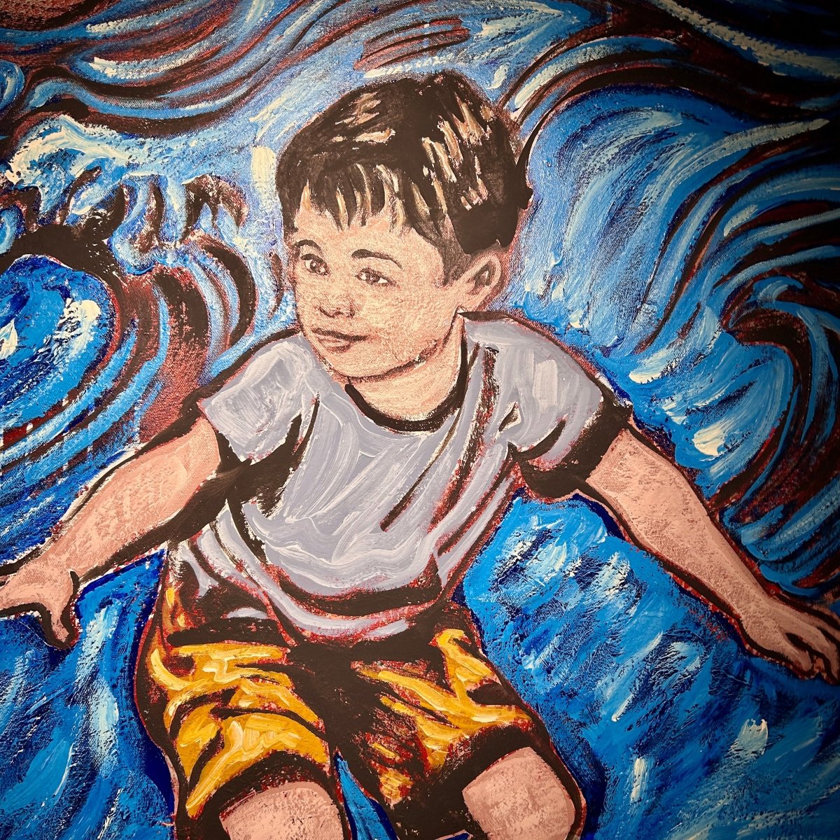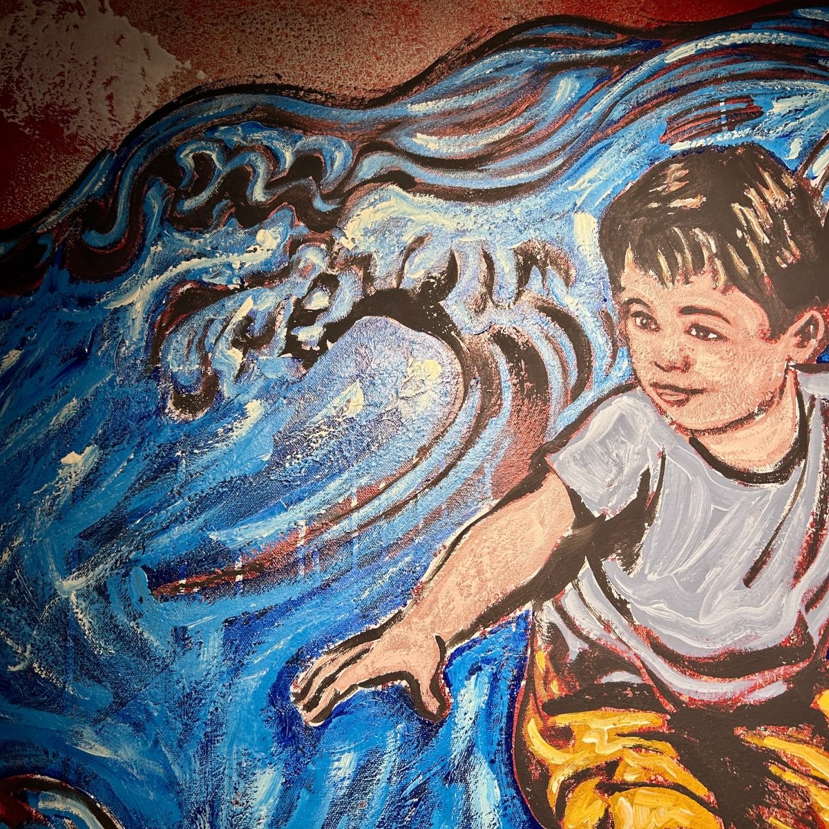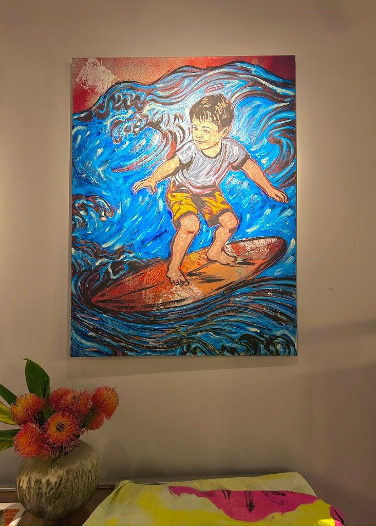 From David Bromley's Children's Series. With meticulous and detailed brushstrokes layered to create a beautiful texture throughout the work, featuring a sea of blues and red tones. Acrylic and oil on canvas - 120 x 90cm. This painting is located at our South Yarra gallery and will be signed prior to delivery